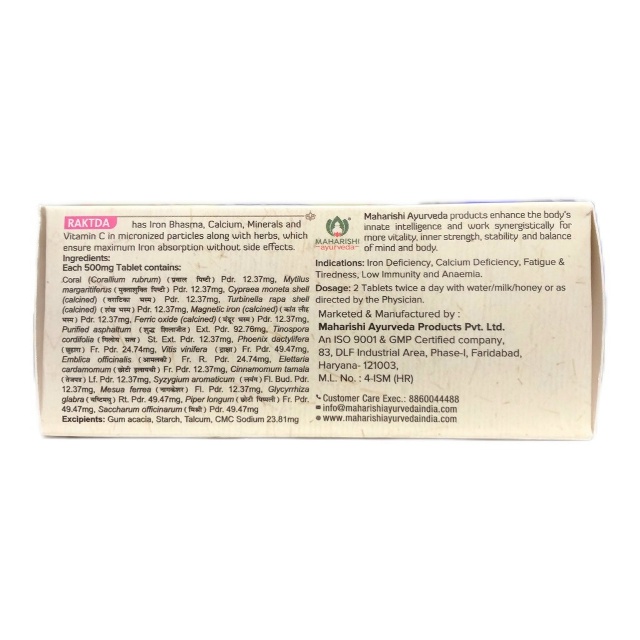 Рактда (Raktda Maharishi Ayurveda) — высокоэффективный аюрведическое средство для улучшения кроветворения и повышения уровня гемоглобина. Формула сочетает растительные компоненты и очищенные минералы (бхасмы), которые легко усваиваются организмом и мягко восстанавливают баланс крови без нагрузки на пищеварение.
